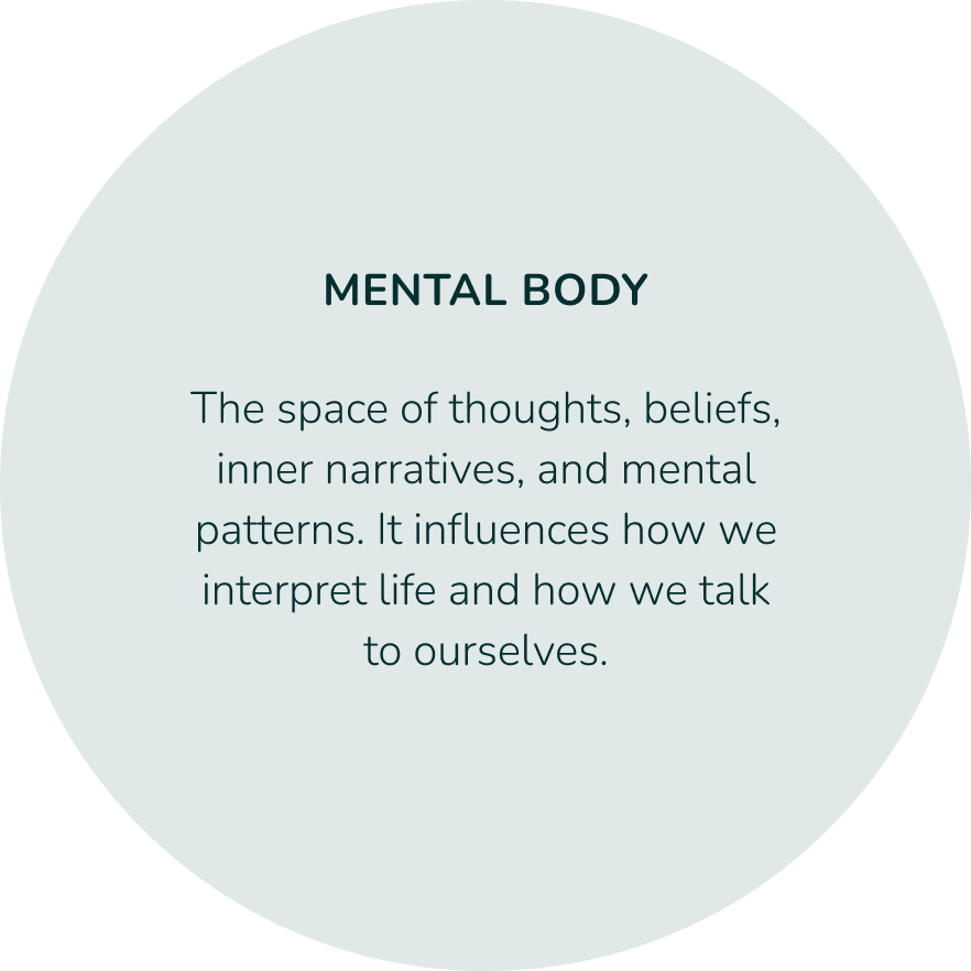 The space of thoughts, beliefs, inner narratives, and mental patterns. It influences how we interpret life and how we talk to ourselves.