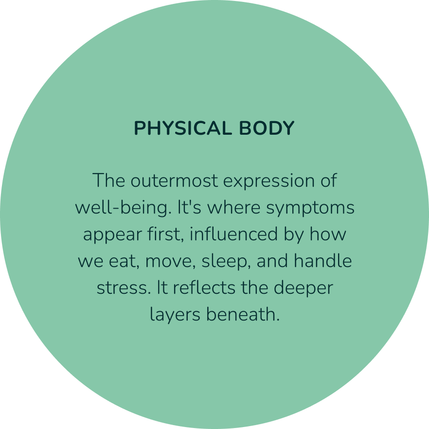 The outermost expression of well-being. It’s where symptoms appear first, influenced by how we eat, move, sleep, and handle stress. It reflects the deeper layers beneath.